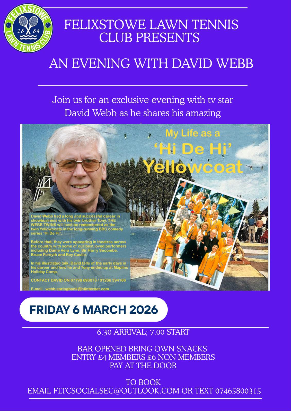 We are pleased to invite you to an evening with TV star David Webb, where he will be sharing his experiences and insights in what promises to be an engaging and enjoyable event.